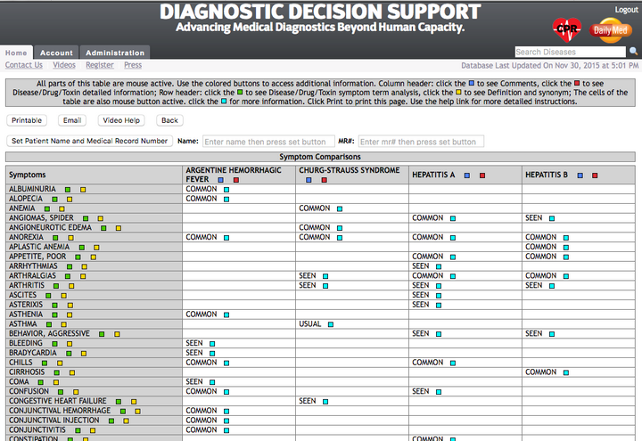 Dxconcur.com is a new professional diagnostic support system that handles both symptoms and lab results. It references over 18,000 causes of human illness and connects them to videos, anatomical drawings, flowcharts, and treatment options. The knowledge base is updated monthly, and its source material comes only from gold-standard journals and texts.